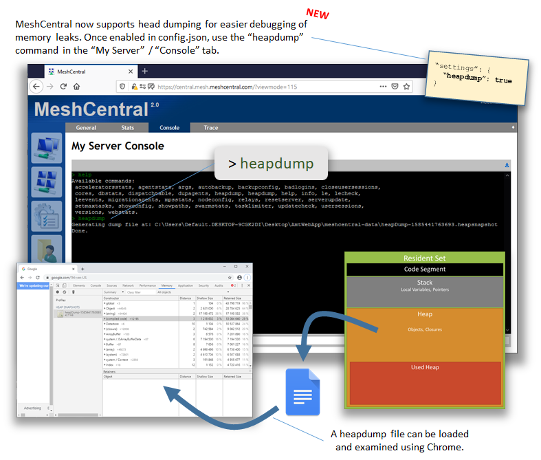 In addition to the big feature, this last week MeshCentral got a lot more bug fixes and a new “HeapDump” feature allowing developers to easily and quickly dump the NodeJS heap to a file and read the file using the Chrome browser. This simplifies greatly the task of finding and fixing memory leaks in the server.
