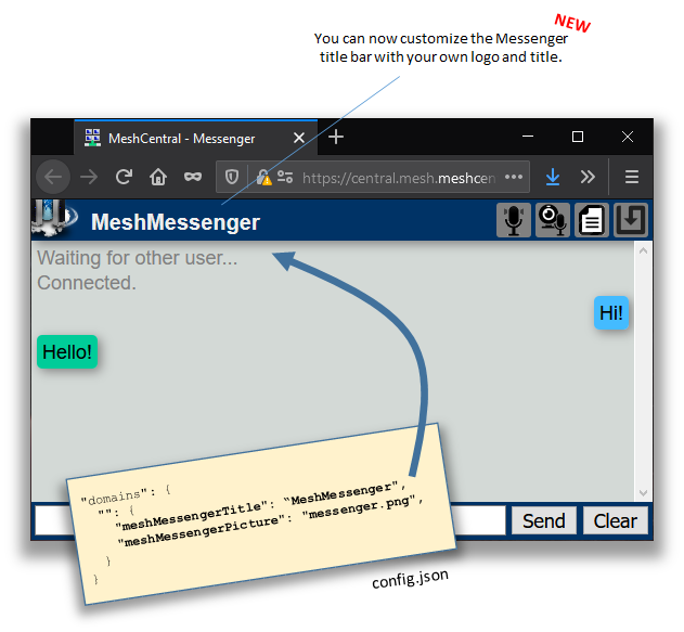 - MeshCentral Messenger customization. Another feature requested by the community was a way to customize the Messenger system built into MeshCentral with custom company name and logo. This is now supported with new configuration options. In addition to this, MeshCentral Messenger will now display an animation when the remote user is typing. This is typical for chat applications and a welcome addition to MeshCentral.