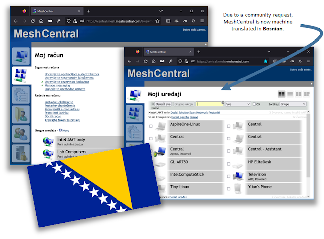 - Bosnian translation. At the request of the community, an auto-translation of MeshCentral in Bosnian was added, this is the 21st language option in MeshCentral. In addition to this, Croatian and Serbian languages were added to the translation tools for future use. This continues to grow the MeshCentral international community.